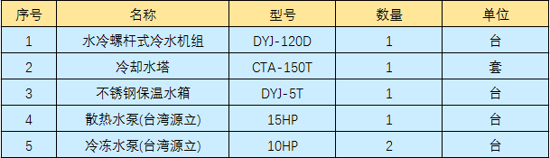 清遠(yuǎn)皮革廠壓花機(jī)橡膠輥冷卻,通過工廠技術(shù)人員核算,需要配120HP水冷螺桿式冰水機(jī)組2臺(tái),客戶直接百度水冷螺桿式冰水機(jī)找到東躍進(jìn)制冷,通過幾天的電話及文字溝通確認(rèn),最終訂購2臺(tái)120HP水冷螺桿式冷水機(jī)組以及輔助設(shè)備,型號(hào)及數(shù)量如下表: